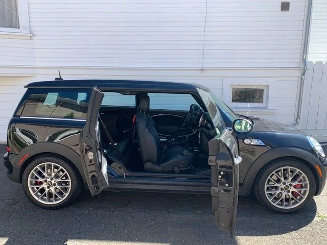 Minis! There they were again! Burrowing into my brain, intoxicating me with their whimsical swagger & charm! So I gave in to the obsession, this mad Mini crush. I had 3 rules in my new search; low miles, low price but high performance. A very tough target to hit. But, after a few test drives of other Minis, the universe was kind enough to allow me to find a 2010 Clubman John Cooper Works on Craigslist. I had done enough research to know what the JCW package means. A nice man named Max in San Rafael was selling his. Six-speed manual transmission, beautiful black paint with a hint of colored sparkle, alloy wheels, sport exhaust, a low & aggressive stance, the entire clutch recently replaced & something called “walnut blasting” done to the manifold. And only 51K miles. I went to see it, and it was love at first sight. True Mini love.