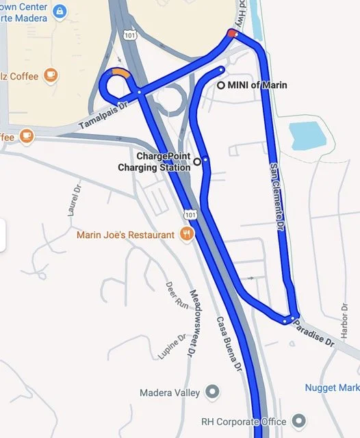 First, we will make a left turn onto Paradise rd., left on San Clemente blvd., crossover the freeway to proceed to the 101 southbound on-ramp to Mill Valley, exit at Camino Alto.
